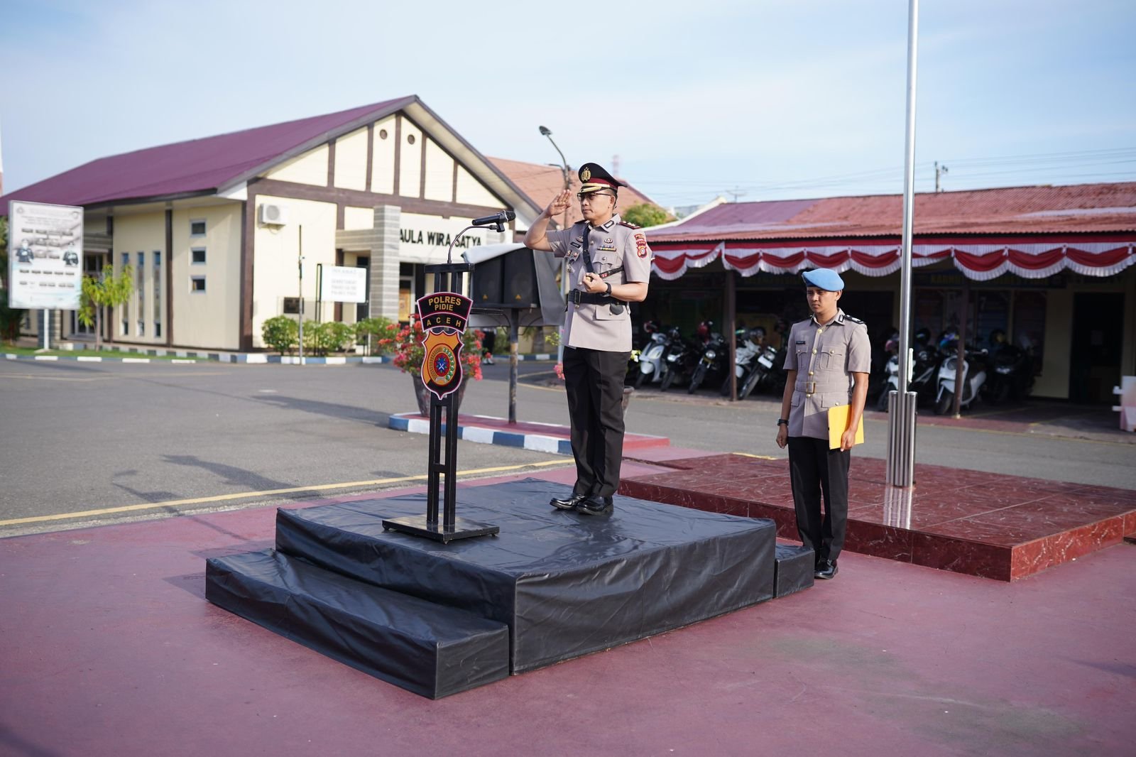 Dalam upacara tersebut, bertindak selaku Komandan Upacara Ipda M. Rizal, SKM, MH., yang sehari-hari menjabat sebagai Kanit Gakkum Satlantas Polres Pidie. Sementara itu, Perwira Upacara dipercayakan kepada AKP Immarsal, SE, yang menjabat Kabag SDM Polres Pidie.