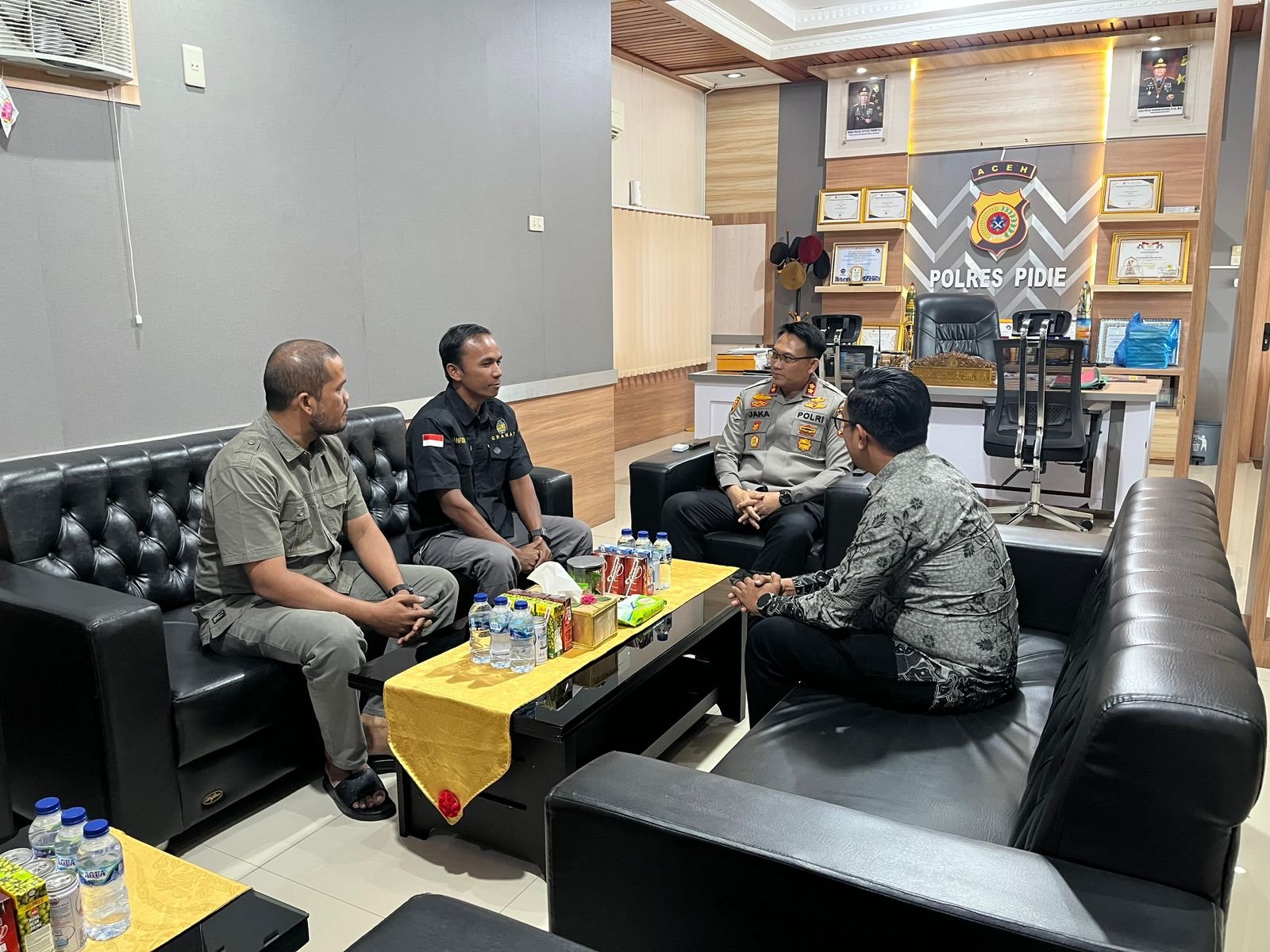 Sigli ( Inforakyataceh ) Kapolres Pidie AKBP Jaka Mulyana, SIK, MIK, menerima audiensi dari Ketua LSM Gerakan Nasional Anti Narkoba (GRANAT) Kabupaten Pidie, Mahfudh MTA, beserta jajaran di ruang kerja Kapolres Pidie, Kamis (21/8/2025).