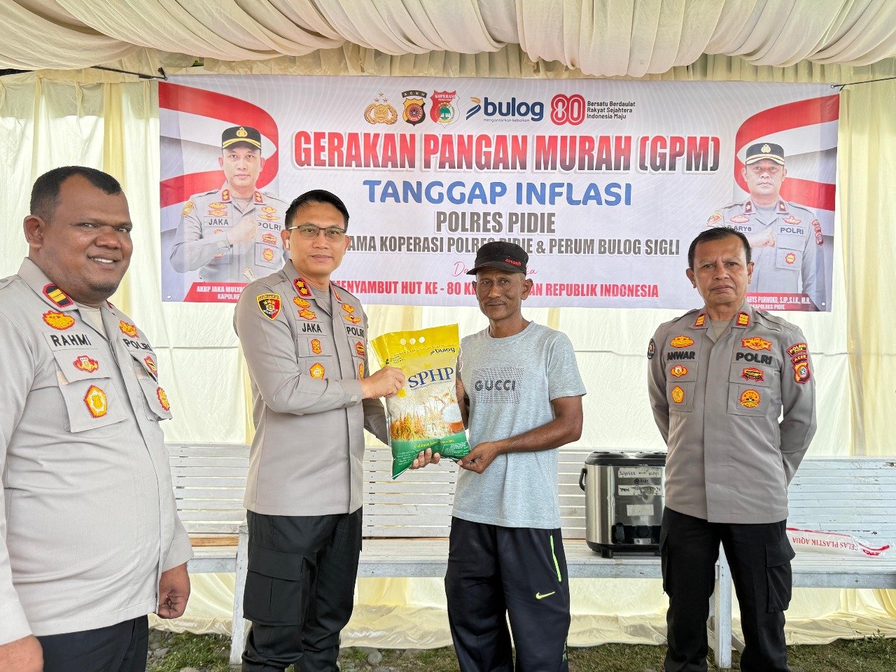 “Polres Pidie melalui koperasi berkomitmen mendukung program pemerintah dalam menjaga stabilitas harga dan menekan inflasi. Dengan adanya Gerakan Pangan Murah ini, masyarakat dapat membeli beras dengan harga lebih terjangkau sehingga kebutuhan pokok tetap terpenuhi,” ujar AKBP Jaka Mulyana, SIK, MIK