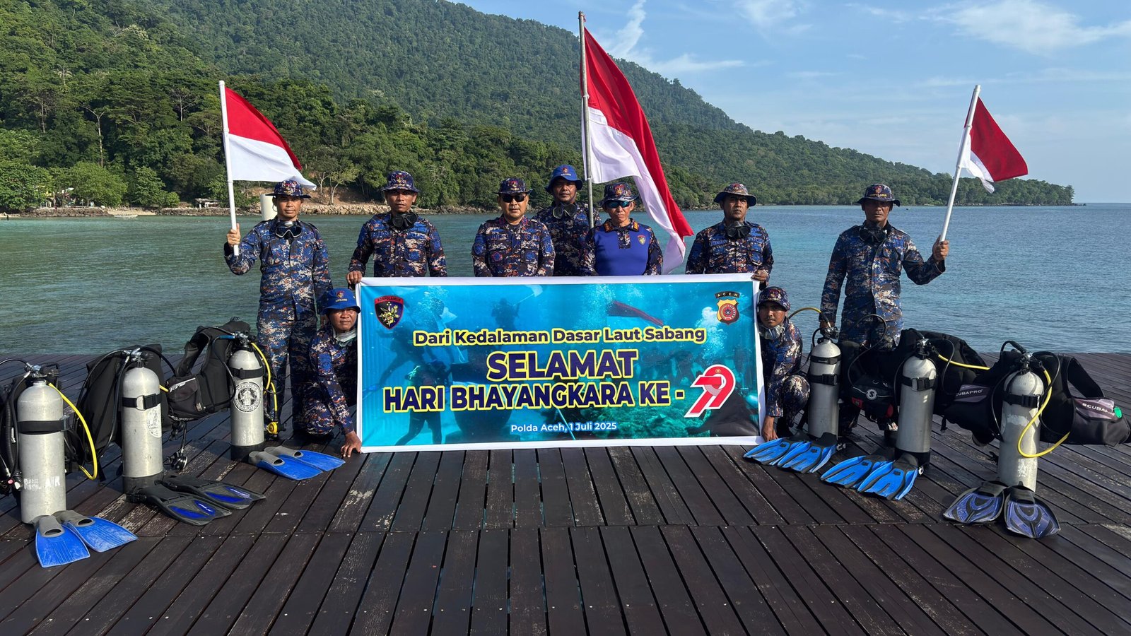 Sabang ( Inforakyataceh ) Dalam rangka memperingati Hari Bhayangkara ke-79, Direktorat Polisi Perairan dan Udara (Ditpolairud) Polda Aceh melaksanakan pengibaran bendera Merah Putih di dasar laut perairan Sabang, Sabtu pagi, 28 Juni 2025.