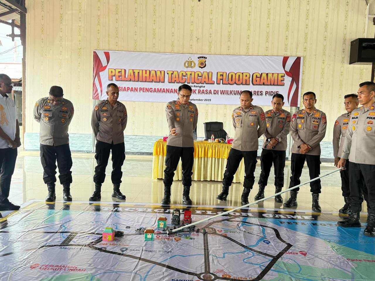 Sigli ( Inforakyataceh ) Polres Pidie melaksanakan kegiatan Tactical Floor Game (TFG) dan simulasi Sistem Pengamanan Kota (Sispamkota) dalam rangka kesiapan pengamanan aksi unjuk rasa di wilayah Kabupaten Pidie. Kegiatan tersebut berlangsung di Aula Dhira Brata, Mapolres Pidie, pada Selasa (9/9/2025) sore.