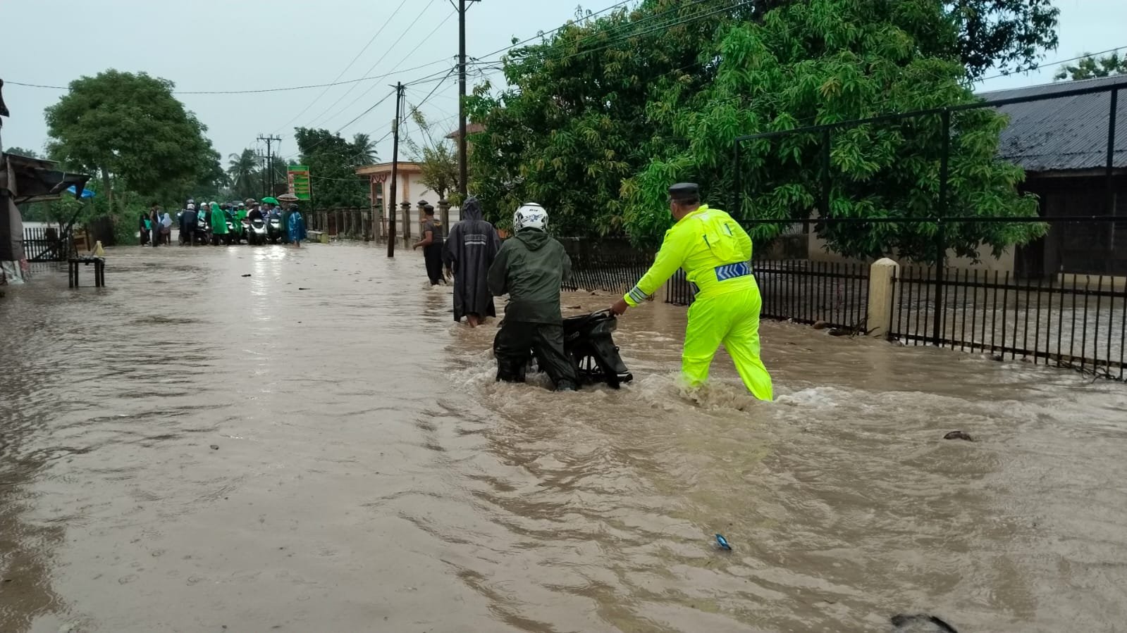 Di tengah genangan banjir yang merendam sejumlah kawasan, personel Polres Pidie bersama instansi terkait terus melakukan upaya pertolongan, mulai dari membantu warga melintas, mengevakuasi korban, hingga mengatur arus lalu lintas pada jalur yang tergenang air di gampong kupula Kecamatan Padang Tiji